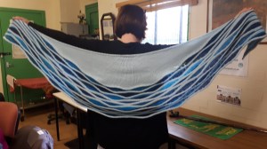 Linda’s blue wave shawl made from yarn she got for her birthday.