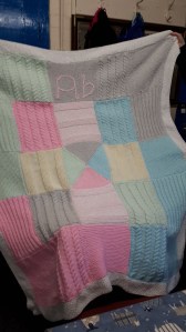 Another talented knitter is Agnes who’s made a beautiful blanket for her grand-daughter Abigail. It’s her own design with the colours chosen by Abigail. It was quite challenging choosing the various patterns for the squares so that they fitted well together. As all knitters know, not all patterns knit up to the same dimensions.