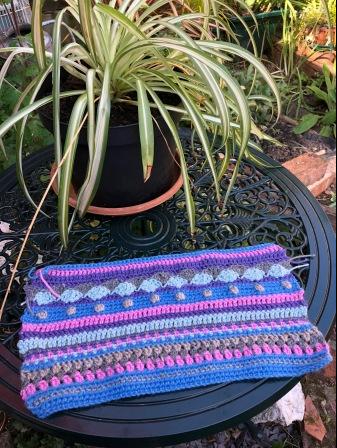 Sheila has finished the blanket she was knitting last week and has started on a cardigan. Perveen has made great progress (she only started to knit a few weeks ago) and has made a cuddly bunny. Agnes has knitted about 10 squares and is near completion of her third blanket. Liz is in the middle of a CAL, which will be a cushion, using a lovely colour combination.