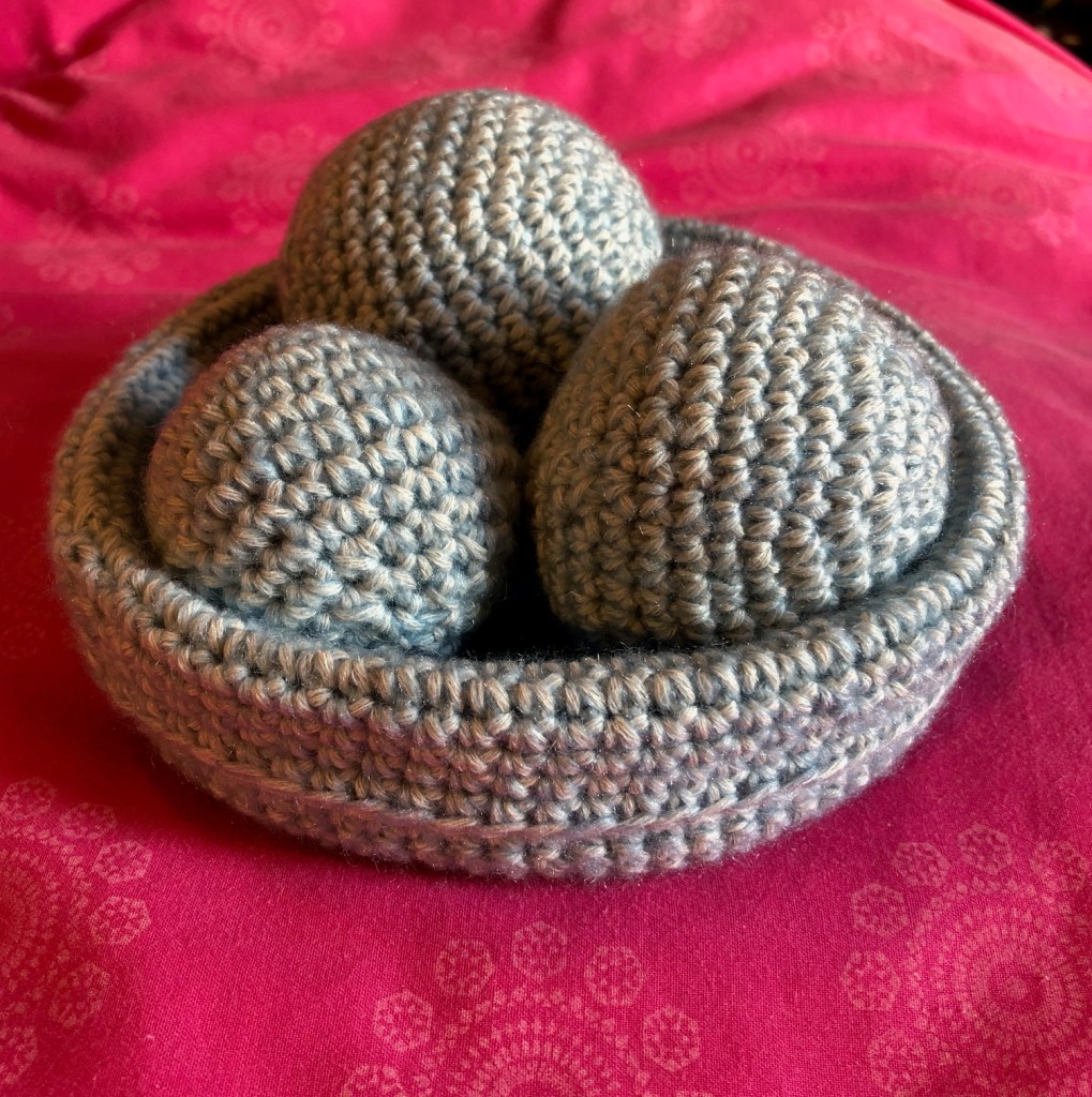 Such a lovely set of blanket, cardi and balls in a basket. Perspective is a bit wonky as the balls aren’t as huge as they appear – they’re not weightlifting medicine balls for baby!